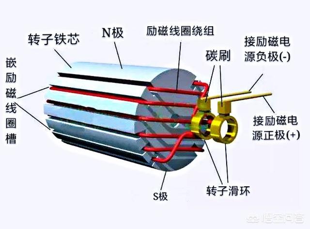 由上圖可知,轉(zhuǎn)子上面繞有線圈,當(dāng)它的線圈中通入勵(lì)磁電源的直流電后就會產(chǎn)生個(gè)固定磁場(N~S磁),磁場的強(qiáng)弱與施加轉(zhuǎn)子中的直流電壓成正比,簡單地說,轉(zhuǎn)子線圈只能夠接受直流電流來產(chǎn)生固定磁場,而直流電只有正與負(fù)(+ -),所以只需要兩根電線進(jìn)入發(fā)電機(jī)的轉(zhuǎn)子中去。